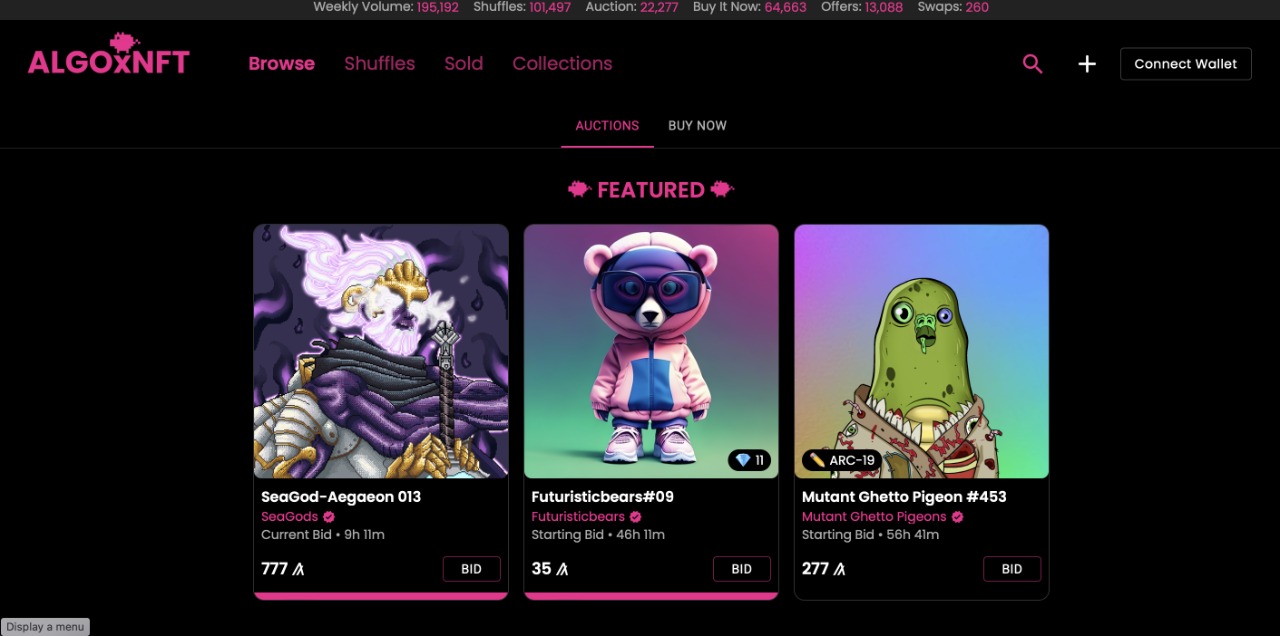 * zero-fee NFT creation, and low-fee marketplace trades (0.001 ALGO fees for bidding, selling, auctioning, or buying NFTs)