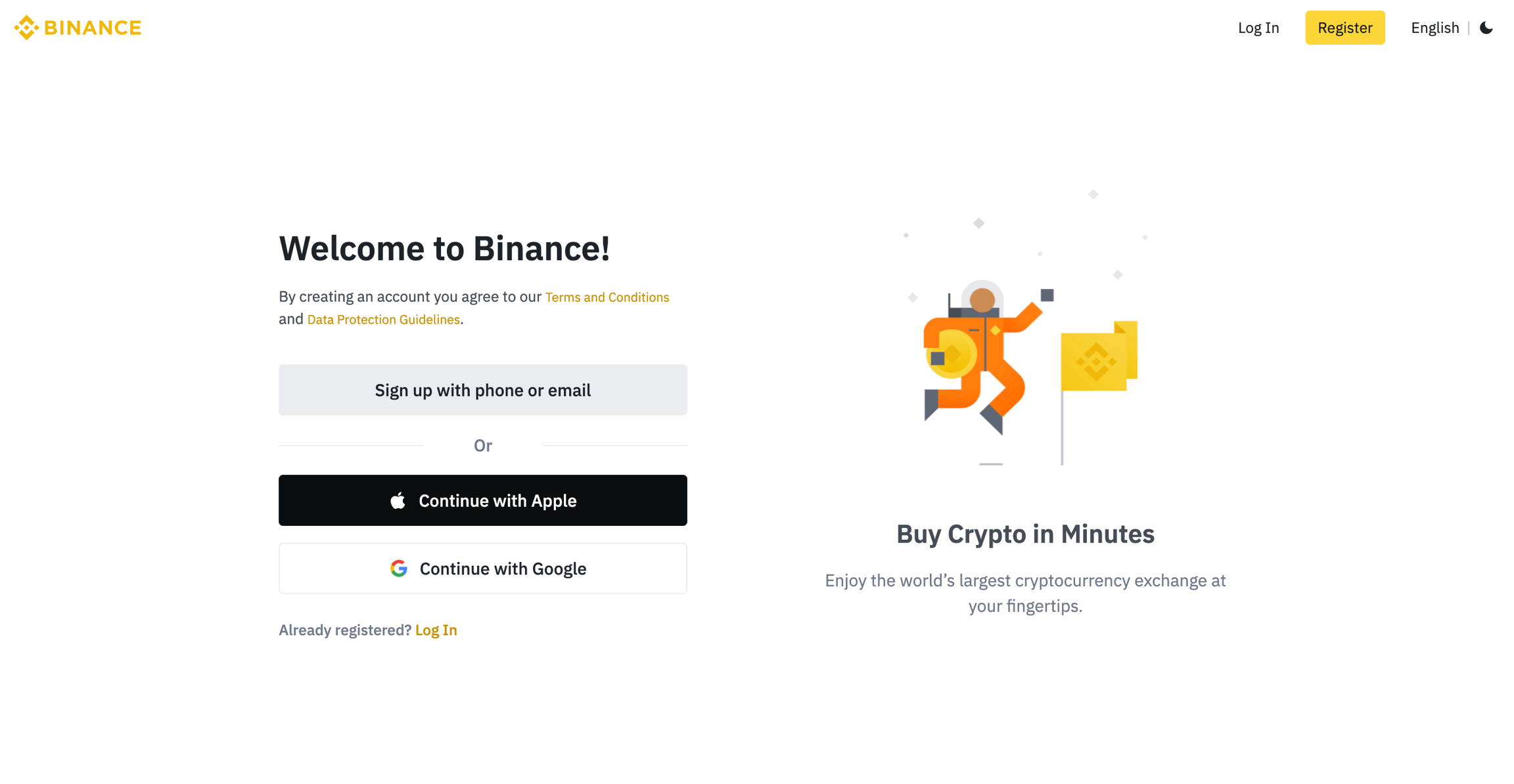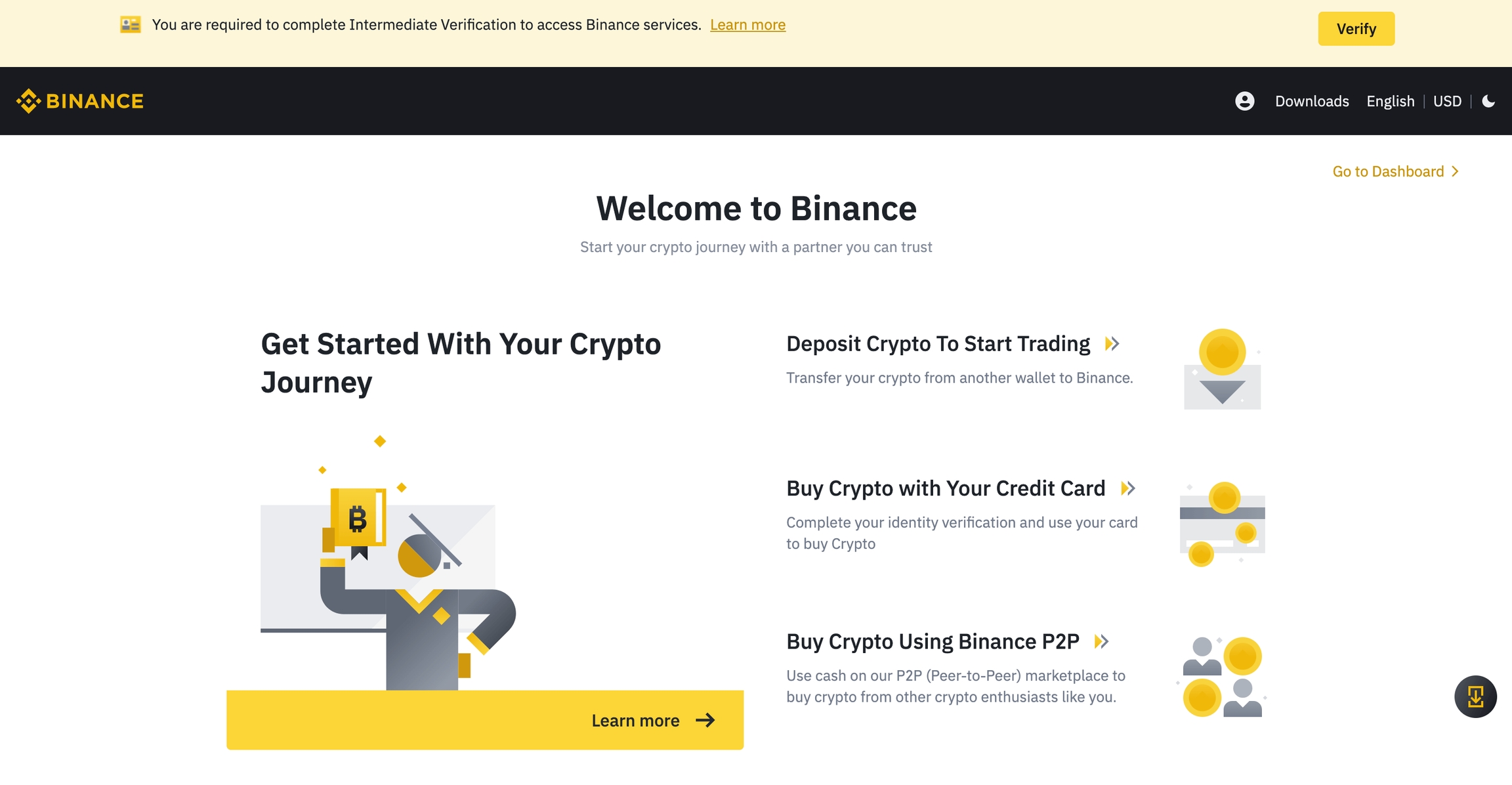 Now that your wallet is set up safely and securely, it’s time to fund your account with some ADA to cover network and minting fees for the NFTs you’re going to create. You’ll need to make use of a centralized cryptocurrency exchange in order to buy ADA with fiat currency. There may be certain restrictions for depositing funds with exchanges depending on which country you’re from. It is important to note that exchanges are becoming more regulated so the setup procedures are stringent, but for the purpose of this guide, we’ll be using the largest cryptocurrency exchange in the world, Binance. The first thing you’ll need to do is open an account with Binance by clicking the ‘Register’ button.