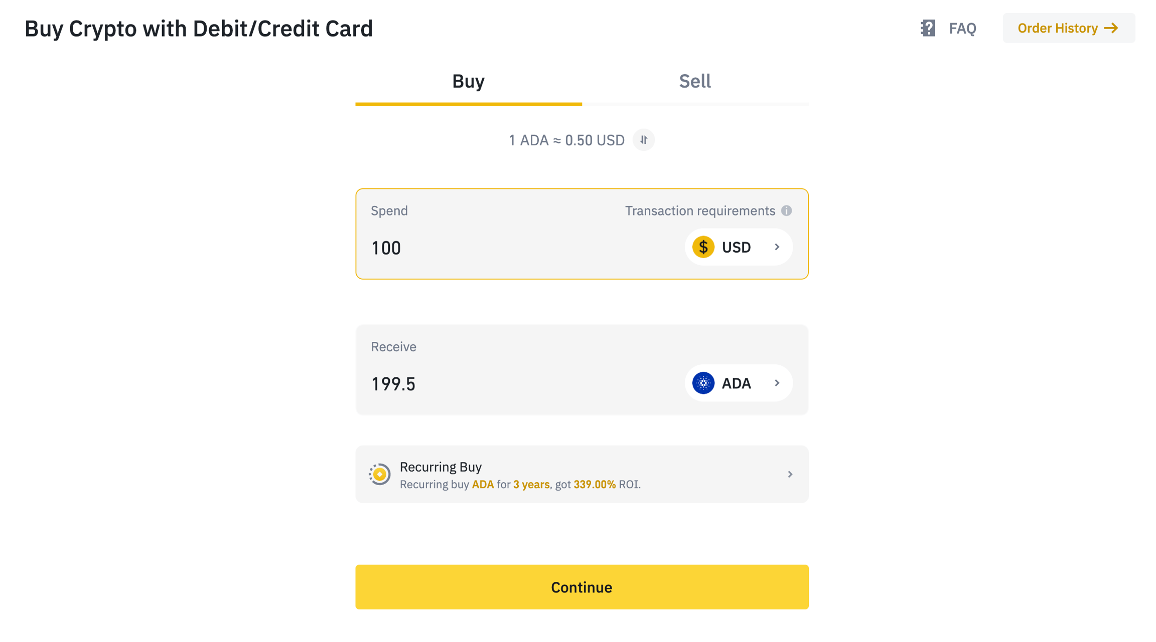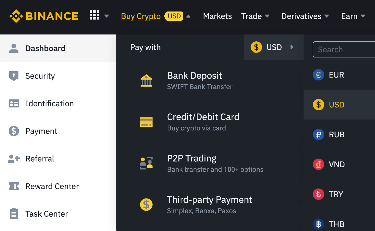 It should take about 5 minutes to submit your personal information and do the biometric facial recognition with your mobile device. Once Binance’s support team has verified your application, it is recommended to add two-factor authentication to secure your account. With all that set up, you’ll be ready to buy some ADA to fund your wallet. To do so, head over to the ‘Buy Crypto’ tab at the top left-hand side of the menu and select the currency you wish to pay in. You can select from many of the world’s biggest currencies, but it’s important to note that depending on the currency you wish to buy with, your options to deposit or purchase directly may be limited.