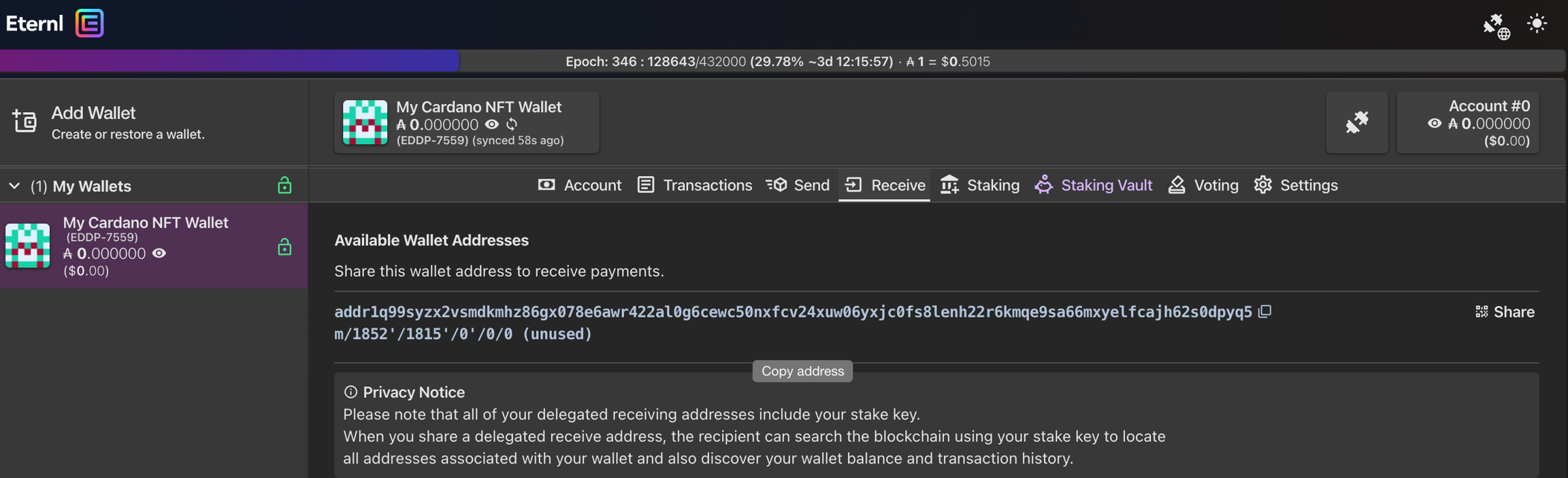 On the next screen, you will be prompted to add an address you wish to send your ADA to. This address can be found in your Eternl wallet under the ‘Receive tab’ where you can click to copy it and paste it into the address field in Binance.