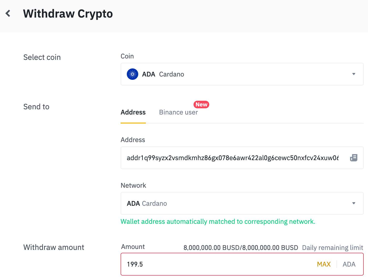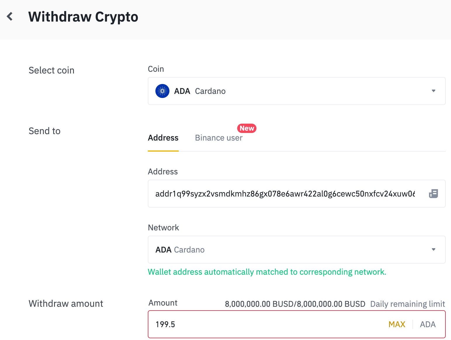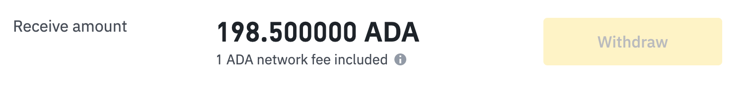 The address you pasted should automatically pick up the ADA Cardano network and this transaction will come with a 1 ADA sending fee. When you’re ready to send, click the yellow ‘Withdraw’ button beneath the Receive amount.